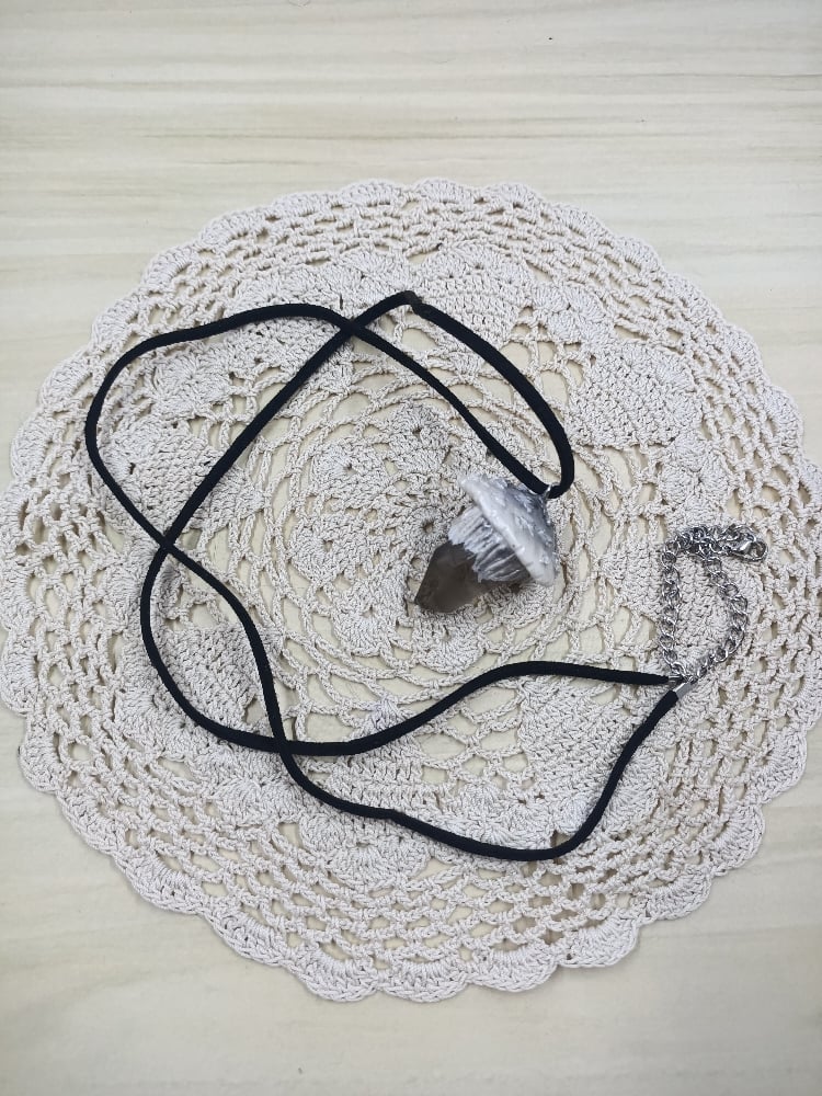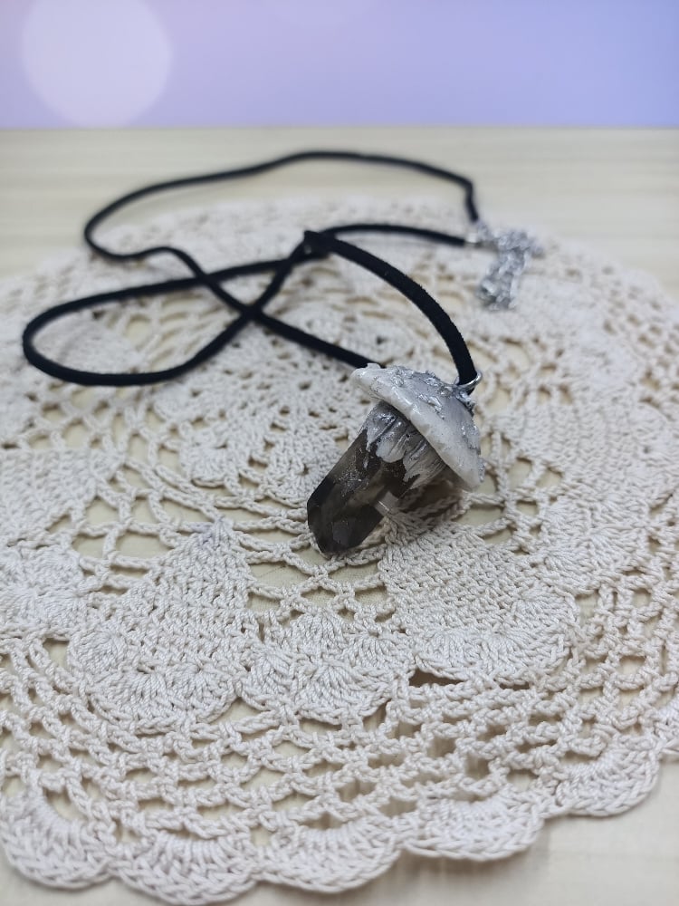 Polymer clay mushroom sculpted atop a smokey quartz.
